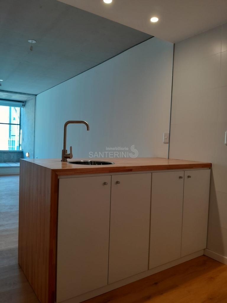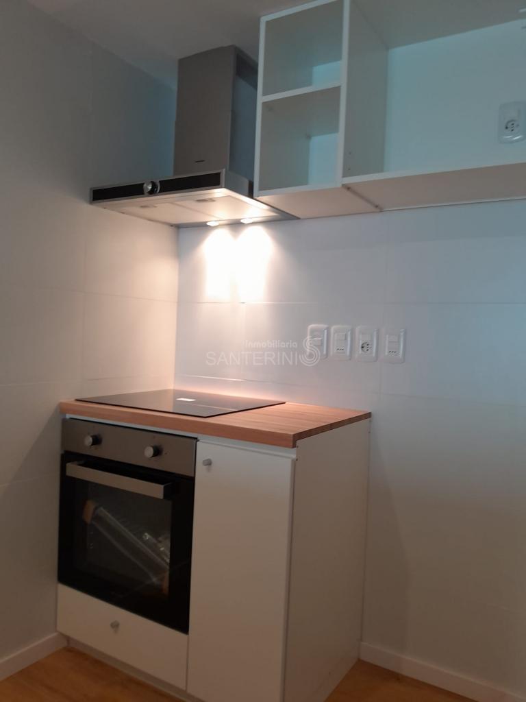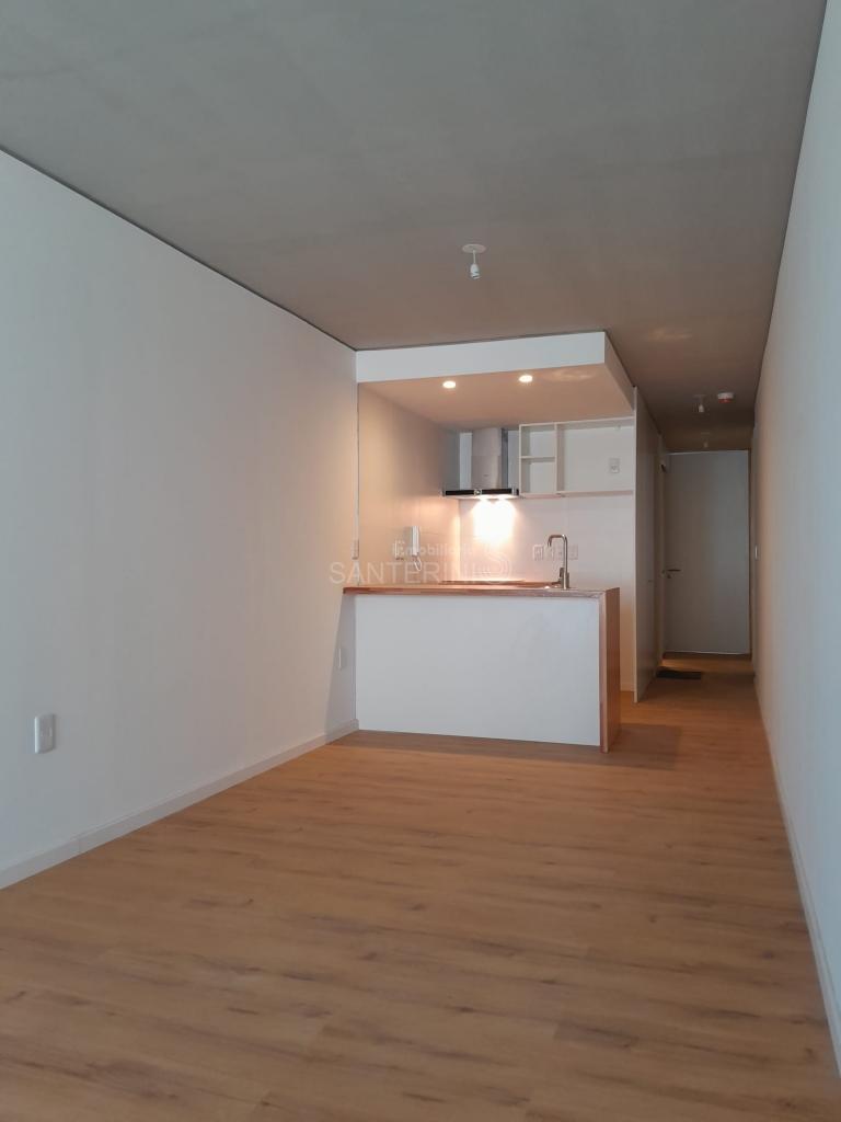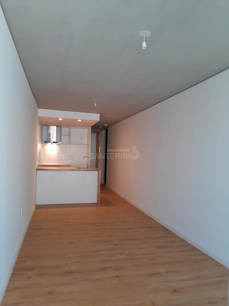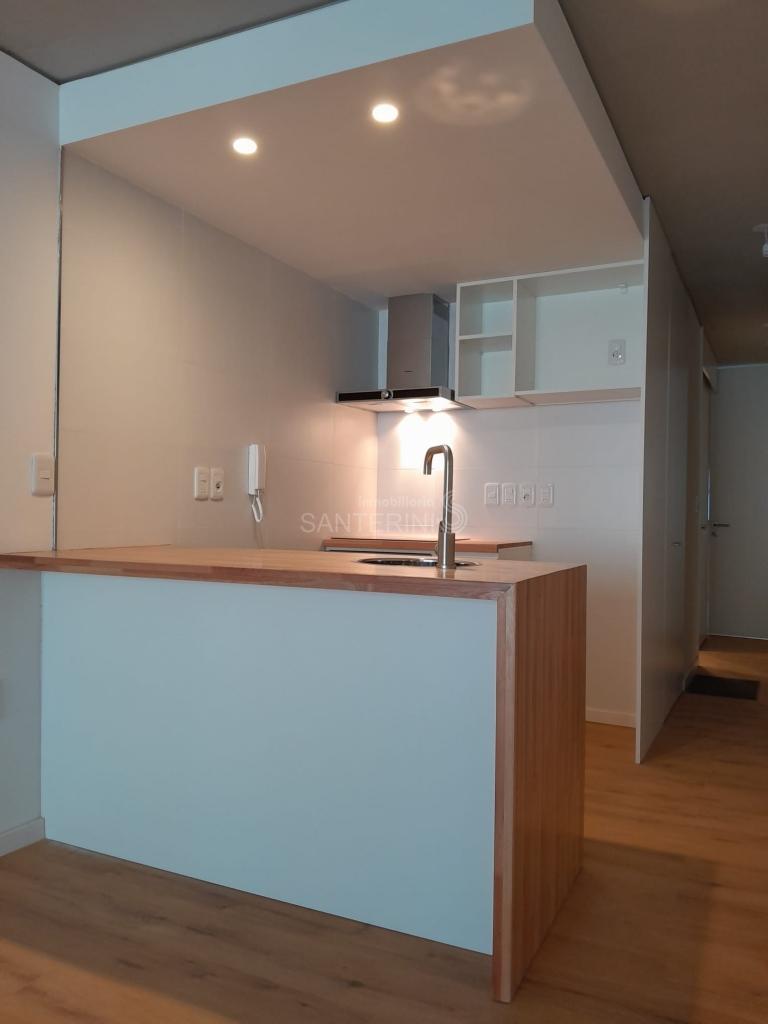 Living comedor con cocina integrada y placares.
